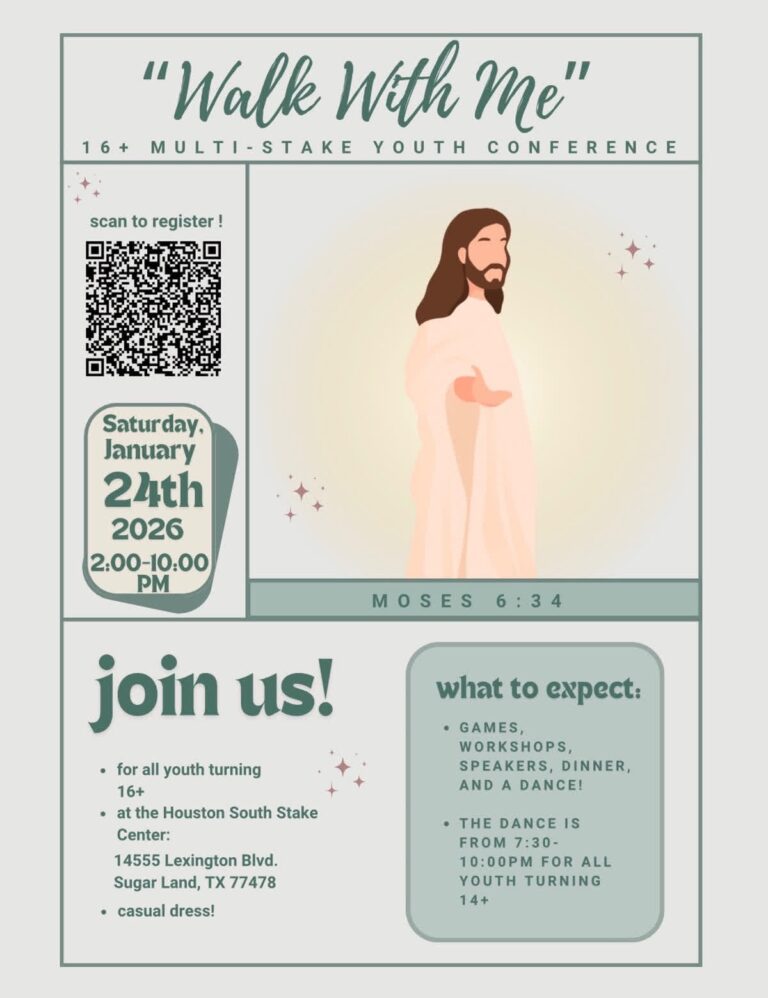 Join youth from across the region for the 16th Multi-Stake Youth Conference at the Houston South Stake Center. Centered on the theme “Walk With Me,” this uplifting event will bring youth together for a meaningful and fun-filled experience focused on faith, connection, and discipleship. The conference will include games, inspiring speakers, engaging workshops, dinner, and a dance. Please plan on casual dress.