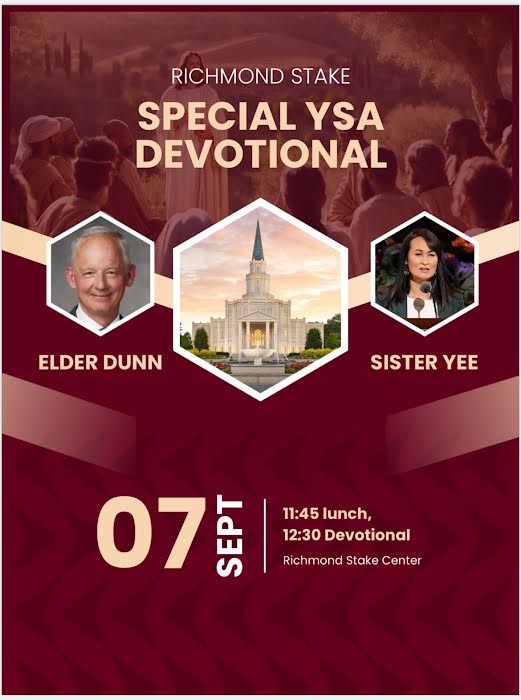All young single adults in the area are invited to a special devotional on Sunday, September 7th at the Richmond Stake Center, located at 9950 S Mason Road, Richmond.